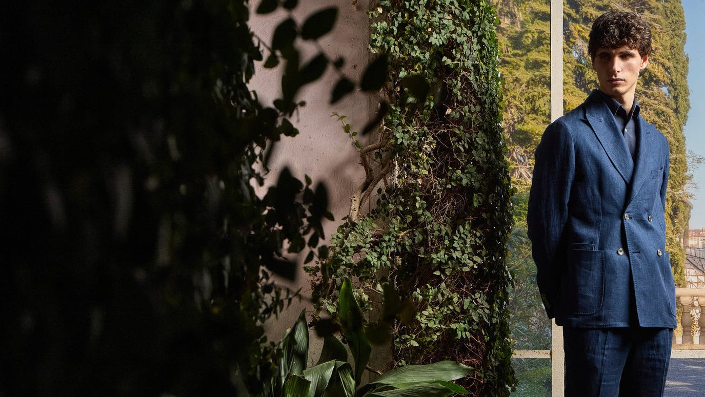 The distinctive riviera collar creates a relaxed open neckline, enhanced by a single mother-of-pearl button that adds a subtle touch of elegance.